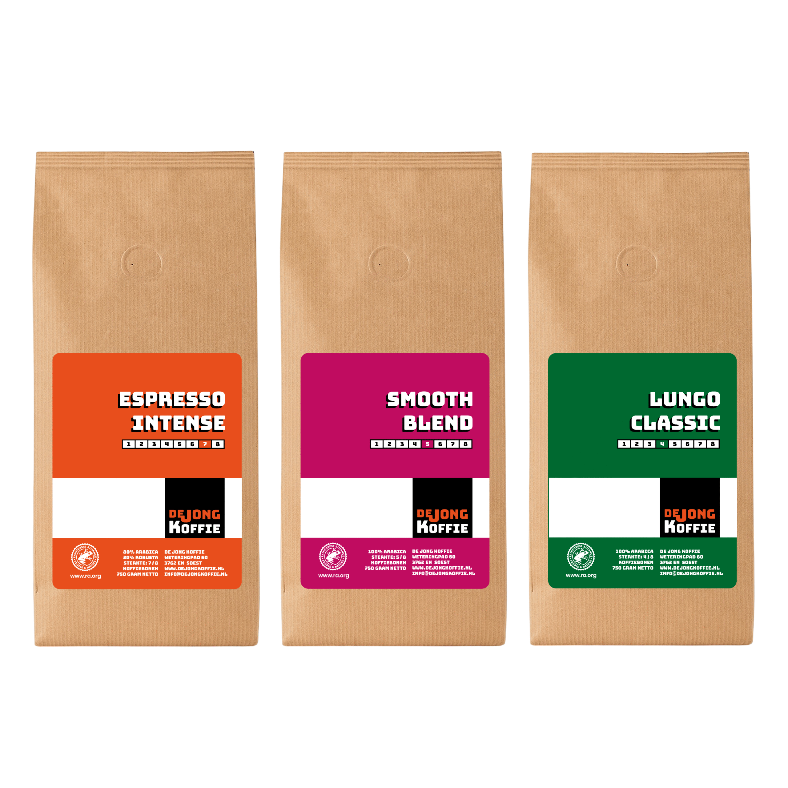 Drie verschillende blends, zorgvuldig gebrand en verpakt in zakken van 750 gram.